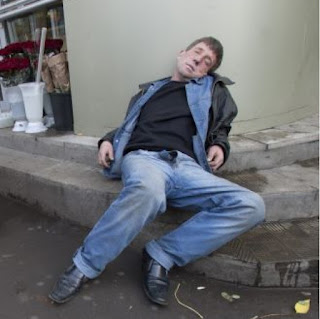 jalas kusemärjad dressipüksid, seljas vana töömehesärk. Jalad